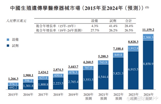 据弗若斯特沙利文数据显示,中国生殖遗传学医疗器械市场从2015年的13亿元增长至2019年的34亿元,复合年增长率达28.4%,并预期在2024年达到112亿元,2019年至2024年的复合年增长率达到26.5%。