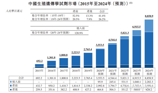 与此同时,中国对PGT的需求也在快速增长。根据弗若斯特沙利文报告,2015年PGT周期数目约3700次,到2019 年已经增加至约30400次,复合年增长率为69.4%,预期在2024年达到约270000 次,复合年增长率为55.3%。