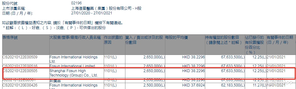 智通财经APP获悉,香港联交所最新资料显示,1月21日,上海复星高科技(集团)增持复星医药(02196)265万股,每股作价38.2296港元,总金额约为1.01亿港元。增持后最新持股数目约为6763.35万股,最新持股比例为12.25%。