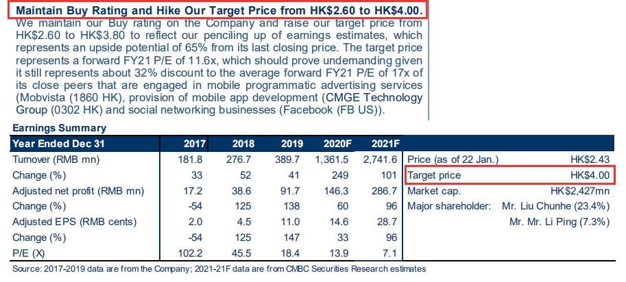 民银资本重申对赤子城科技的“买入”评级,并将目标价从2.6港元上调至4港元。该目标价下,赤子城科技2021财年远期市盈率(forward FY21 P/E)为11.6x。其同类业务公司的2021财年远期市盈率平均可达17x,赤子城科技在上述目标价下的市盈率仍偏低32%。