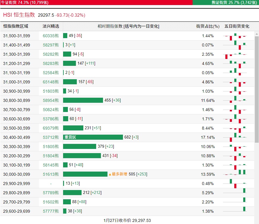 智通财经APP获悉,截至1月28日,恒指最新的牛熊街货比例为74:26 。