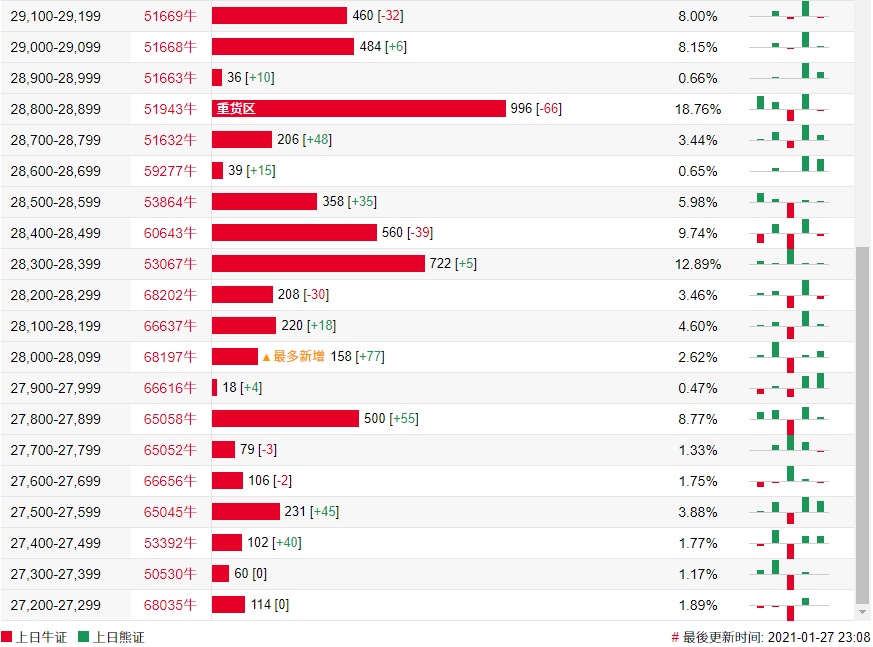 法兴恒指牛熊证街货分布图中的数据显示,熊证街货重货区在30400-30499区间,该区间最新熊证数量为682张,较上一交易日增加3张,最多新增在30000-30099区间,熊证数量为505张,增加253张。牛证街货重货区在28800-28899区间,该区间最新牛证数量为996张,较上一交易日减少66张。最多新增在28000-28099区间,该区间最新牛证数量为158张,较上一交易日增加77张。