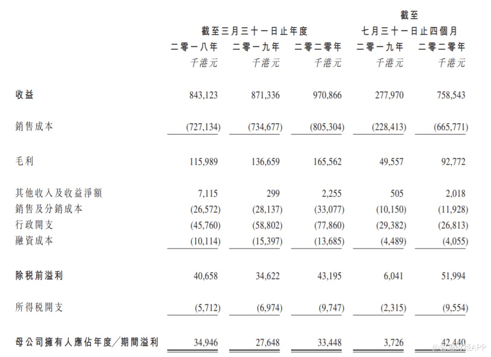 招股书显示,截至2018年、2019年及2020年3月31日止年度及2020年7月31日止四个月,环联连讯的收益分別约为8.43亿港元、8.71亿港元、9.71亿港元及7.59亿港元。毛利分别为1.16亿港元、1.37亿港元、1.66亿港元及9277.2万港元;母公司拥有人应占年度溢利分别为3494.6万港元、2764.8万港元、3344.8万港元及4244万港元。