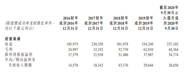 公司的收益从2017财年的约2.306亿港元增加至2018财年的约3.02亿港元,于2019财年的收益进一步增加至3.342亿港元,并由截至2019年9月30日止九个月的约2.556亿港元下降约至截至2020年9月30日止九个月的约2.371亿港元。公司的毛利率保持大致稳定,2016财年约为13.4%,2017财年约为14.0%,2018财年增至约17.5%,截至2020年9月30日止九个月的毛利率约为18.7%。