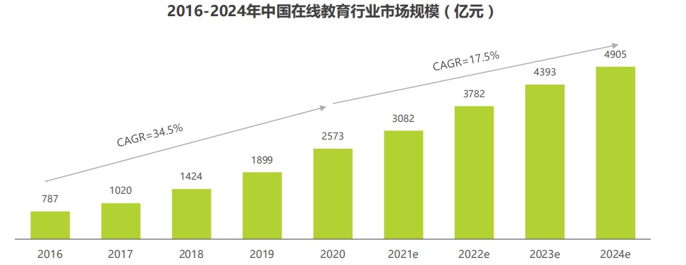从政府前期“闭门不出”的要求,到后面“停课不停学”的号召,一定程度上培养了人们接受在线教育的习惯,推动在线教育的普及,故而使得在线教育迎来爆发的风口:艾瑞咨询测算,2020年中国在线教育行业市场规模2573亿元,过去4年的CAGR达34.5%,同时公共卫生事件还加快了2020年的在线教育进程,将透支一部分2021年的增速。