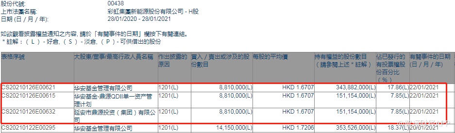 智通财经APP获悉,香港联交所最新资料显示,1月22日,华安基金及一致行动人减持彩虹新能源(00438)881万股,每股作价1.6707港元,总金额约为1471.89万港元。减持后最新持股数目约为3.44亿股,最新持股比例为17.86%。