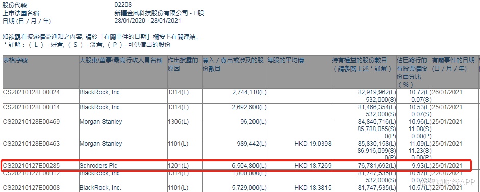 智通财经APP获悉,香港联交所最新资料显示,1月25日,Schroders Plc减持金风科技(02208)650.48万股,每股作价18.7269港元,总金额约为1.22亿港元。减持后最新持股数目约为7678.17万股,最新持股比例为9.93%。