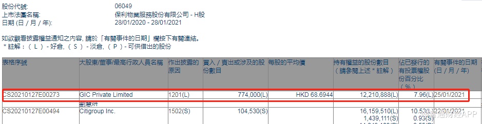 智通财经APP获悉,香港联交所最新资料显示,1月25日,GIC Private Limited减持保利物业(06049)77.4万股,每股作价68.6944港元,总金额约为5316.95万港元。减持后最新持股数目约为1221.09万股,最新持股比例为7.96%。