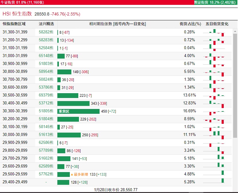 智通财经APP获悉,截至1月29日,恒指最新的牛熊街货比例为82:18。