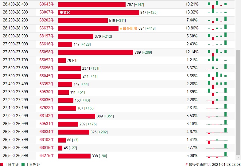 法兴恒指牛熊证街货分布图中的数据显示,熊证街货重货区在30300-30399区间,该区间最新熊证数量为450张,较上一交易日增加72张,最多新增在29500-29599区间,熊证数量为133张,增加133张。牛证街货重货区在28300-28399区间,该区间最新牛证数量为847张,较上一交易日增加125张。最多新增在28100-28199区间,该区间最新牛证数量为634张,较上一交易日增加413张。