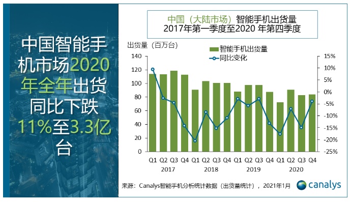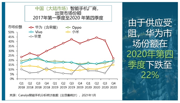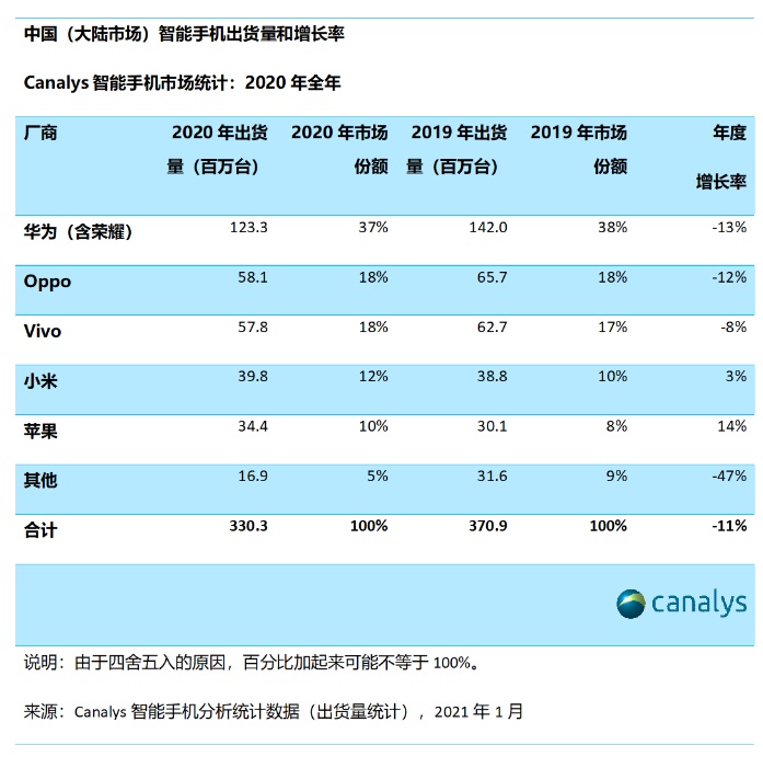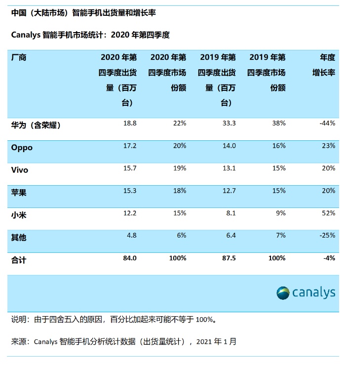 其他数据方面,中国大陆智能手机市场2020年全年出货量同比下跌11%至3.3亿台。华为(包括荣耀)第四季度出货1880万台。Oppo迅速上升至第二位,出货1720万部智能手机,同比增长 23%。Vivo取得20%同比增长,以1570万台排在第三位。苹果(AAPL.US)第四季度出货量超过1530万台,市场份额为18%,高于2019年第四季度的15%。小米(01810)排名第五名,发货量1220万台,同比增长52%。
