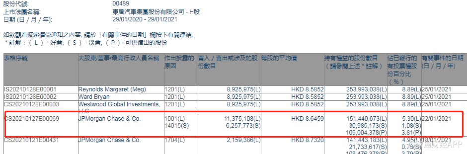 智通财经APP获悉,香港联交所最新资料显示,1月22日,摩根大通增持东风集团股份(00489)1137.51万股,每股作价8.6459港元,总金额约为9834.80万港元。增持后最新持股数目约为1.51亿股,最新持股比例为5.30%。