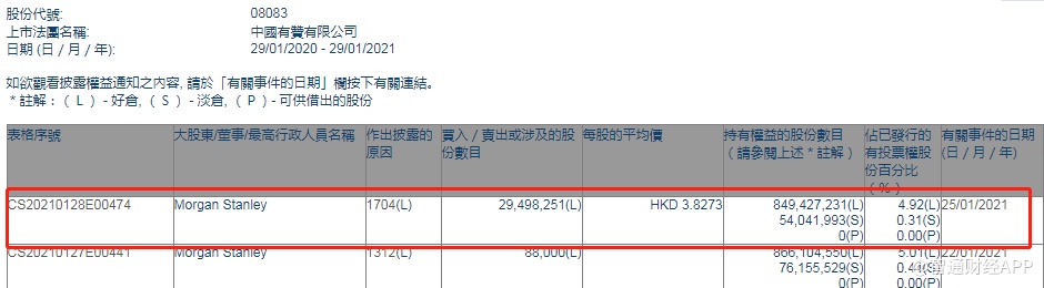 智通财经APP获悉,香港联交所最新资料显示,1月25日,摩根士丹利减持中国有赞(08083)约2949.83万股,每股作价3.8273港元,总金额约为1.13亿港元。减持后最新持股数目约为8.49亿股,最新持股比例为4.92%。