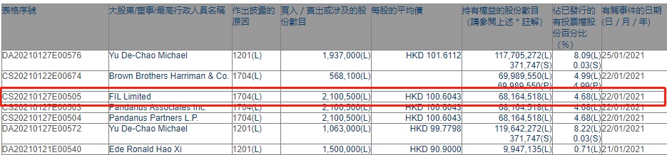 智通财经APP获悉,香港联交所最新资料显示,1月22日,FIL Limited减持信达生物-B(01801)210.05万股,每股作价100.6043港元,总金额约为2.11亿港元。减持后最新持股数目约为6816.5万股,最新持股比例为4.68%。