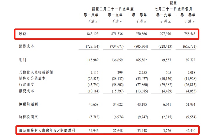 据招股书显示,2018财年-2020财年,环联连讯实现营业收入分别为8.43亿港元、8.71亿港元、9.71亿港元,年复合增长率为7.3%。至2021财年前四个月,该公司实现营收7.59亿港元,同比增长173.02%。