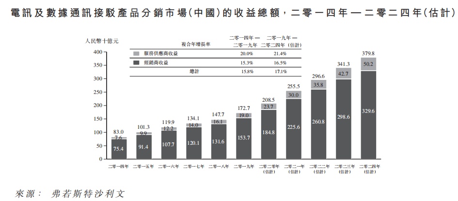 弗若斯特沙利文数据显示,于2019年,电讯及数据通讯接驳产品分销市场的收益总额达1727亿元,自2014年至2019年的复合年增长率为15.8%。于2024年,电讯及数据通讯接驳产品的经销商(包括服务提供商)的收益总额预计将达3798亿元,自2019年至2024年的复合年增长率为17.1%。