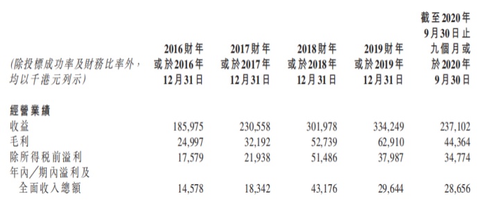 智通财经APP注意到,过往业绩期间盈汇企业的业绩状况较为稳定。2017财年至2020财年前九个月,公司收益分别为约2.31亿元、3.02亿元、3.34亿元和2.37亿元。期间净利润分别达到约1834.2万元、4317.6万元、2964.4万元和2865.6万元。期间毛利率呈现上升趋势,分别达到14%、17.5%、18.8%和18.7%。