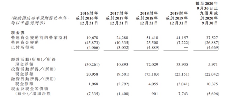 据盈汇企业招股书,2016财年至2020财年前9个月,公司现金及现金等价物以净减少为主。仅在2018财年和2019财年共计净流入864.4万元。截至2020年9月30日,公司现金及银行结余为1560.4万元,这已是自2016财年以来最佳表现。