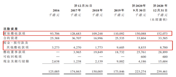 此外,公司自2017年以来每年的贸易应收款项均超过亿元。其中2020财年贸易应收款项达到1.52亿元,占流动资产的63.6%。