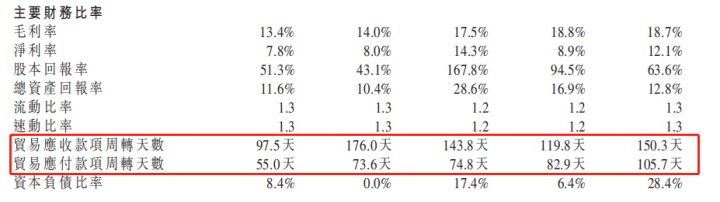 不仅如此,盈汇企业贸易应收款项的周转效率也低于贸易应付款项。2020财年,公司贸易应收款项的周转天数达到150.3天,而贸易应付款项周转天数为105.7天。