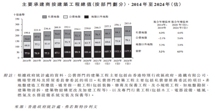 据弗若斯特沙利文报告,2020年至2024年期间香港主要承建商所完成建造工程总值预期将以4.5%的复合年增长率增长至2850亿元。