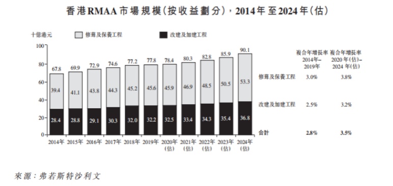 随着对老化楼宇的各种强制性检验要求(如强制验楼计划)及老化楼宇的更新和重新发展不断推动对RMAA工程的需求,香港RMAA工程的市场规模稳步增长,收益由2014年的约678亿元增加至2019年的约778亿元,复合年增长率为2.8%。预计2020年至2024年RMAA工程的市场规模将以3.5%的复合年增长率进一步增长,到2024年达到约901亿港元。