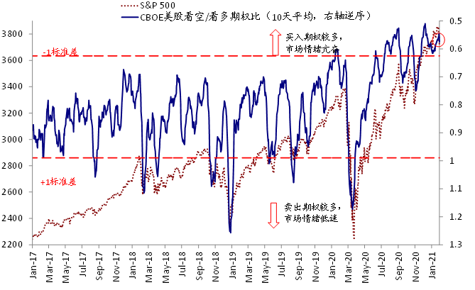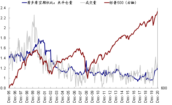 ii. 期权未平仓量:通过期权也可以实现加杠杆的目的,2020年下半年以来,芝加哥商品交易所(CBOE)所有未平仓的看多期权(CallOption)量激增至212万份,较上半年大幅增长30%,也使得多空未平仓量比例升至2008年以来的高位。