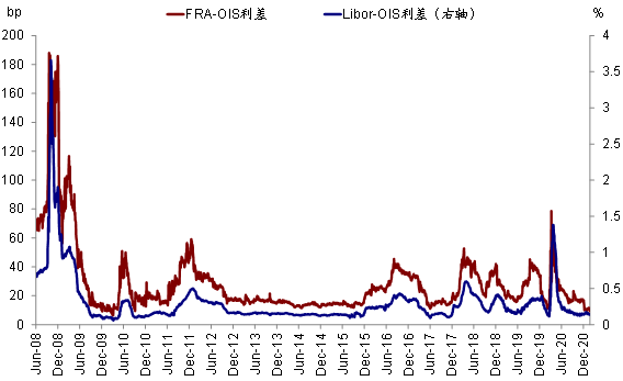 i. Libor/FRA-OIS利差:由于参与者主体为银行等金融机构,因此主要衡量金融系统内的流动性情况,这也是为什么2008年这一指标飙升而2020年3月疫情爆发时并没有的主要原因,因为本轮疫情危机主要发生在非金融企业而非金融体系。目前二者均处于历史低位,表明金融体系流动性依然非常充裕。