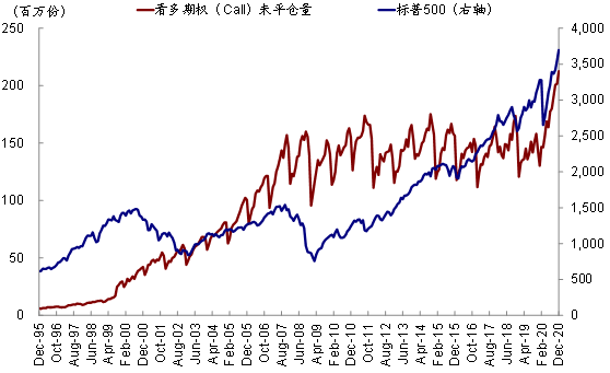 图表14: 2020年下半年以来,芝加哥商品交易所(CBOE)所有未平仓的看多期权(Call Option)量激增至212万份,较上半年大幅增长30%