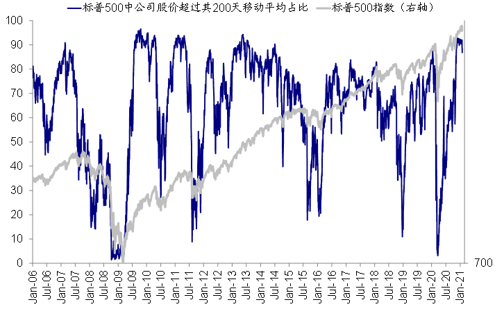 i. 200天均线以上个股占比:刻画市场涨跌强度,当前标普500指数为86.8%,从12月底的92%略有回落,但仍处高位。