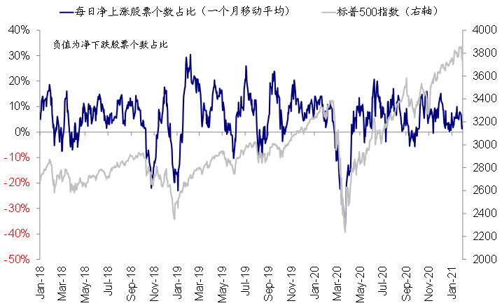 ii. 上涨下跌家数占比:衡量市场表现集中度,过高时表明整体情绪亢奋;两者背离时,如指数上涨但比例下降则表明指数为较少个股驱动,去年12月以来即是如此。