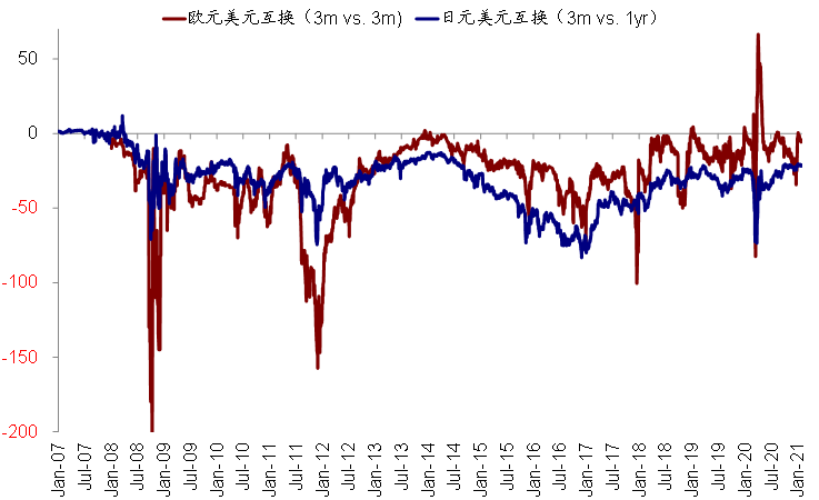 图表18: 美元与欧元日元互换利差(Swap),主要用以衡量全球美元的充裕程度,目前处于低位