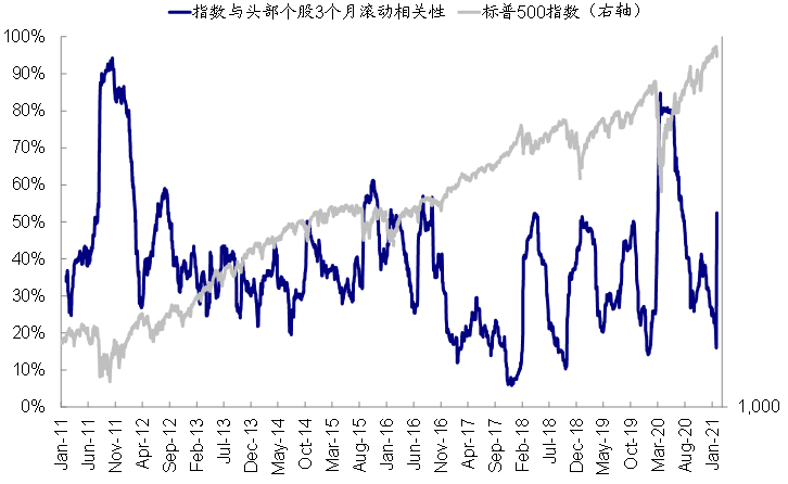 图表7: 指数与权重股隐含波动率相关性,处于低位意味着市场和权重股的预期波动明显“背离”,上周波动前降至16%的低位,周五飙升至52%的历史相对高点