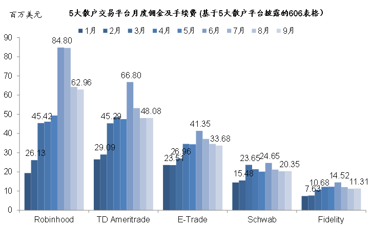 图表10: 我们汇总美国5家个人投资最为常用的平台,如Robinhood、TD Ameritrade等,发现其交易佣金在6月达到最高点