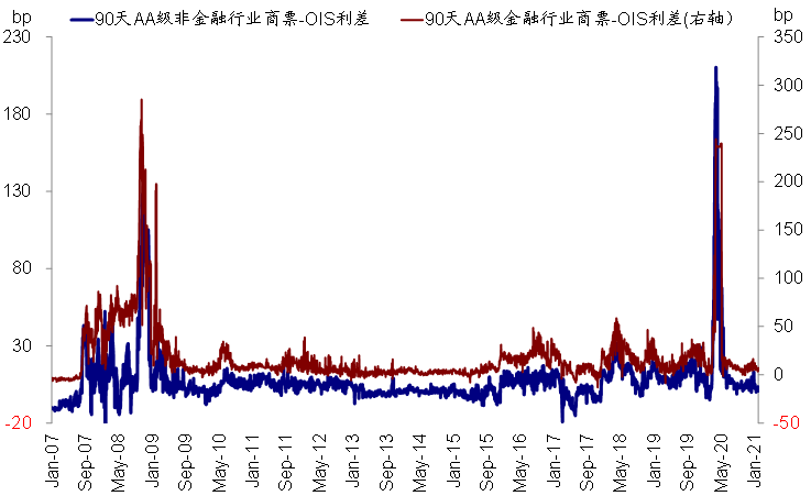 图表17: 商业票据利差目前也处于历史低位,表明企业融资市场流动性也依然充裕