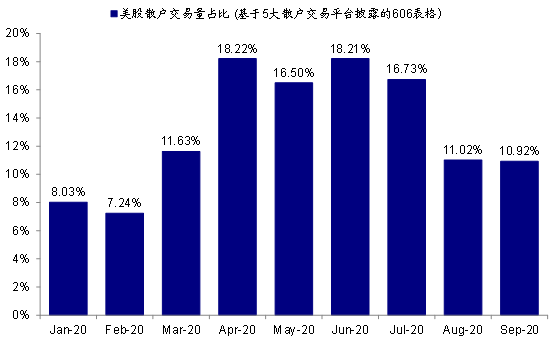图表11: 且通过这5家平台的交易量占美股总成交也持续攀升,二季度一度高达18.2%,三季度有所回落
