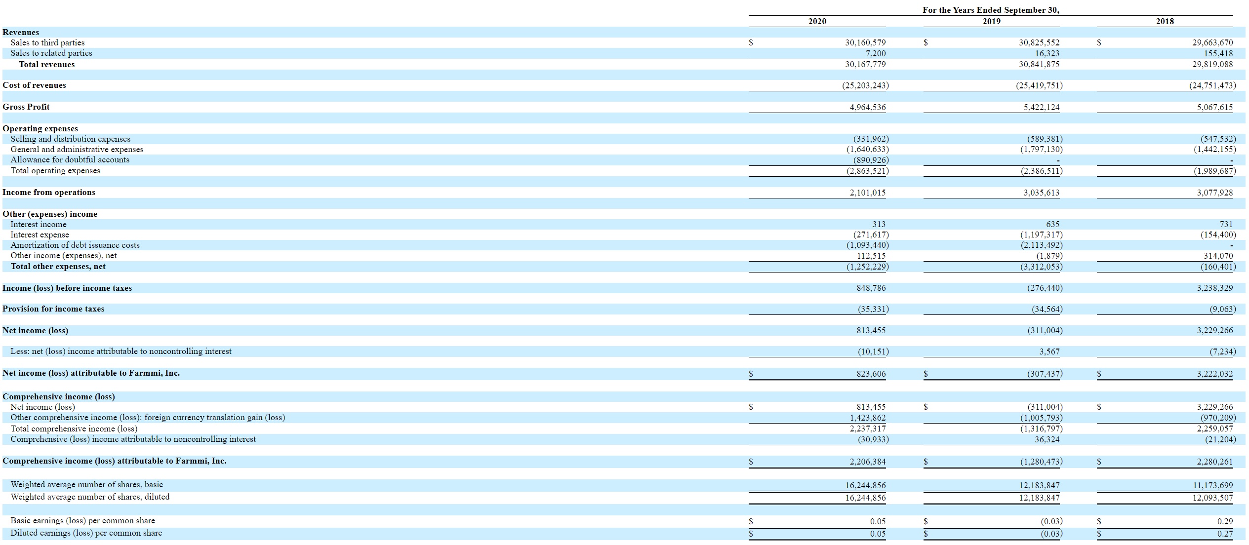 智通财经APP获悉,农米良品(FAMI.US)于1月29日向美国SEC递交了20F报告,披露了公司截至2020年9月30日的2020财年年报和最新股权结构,其中公司2020财年营收为3016.78万美元,归母净利润为82.36万美元。