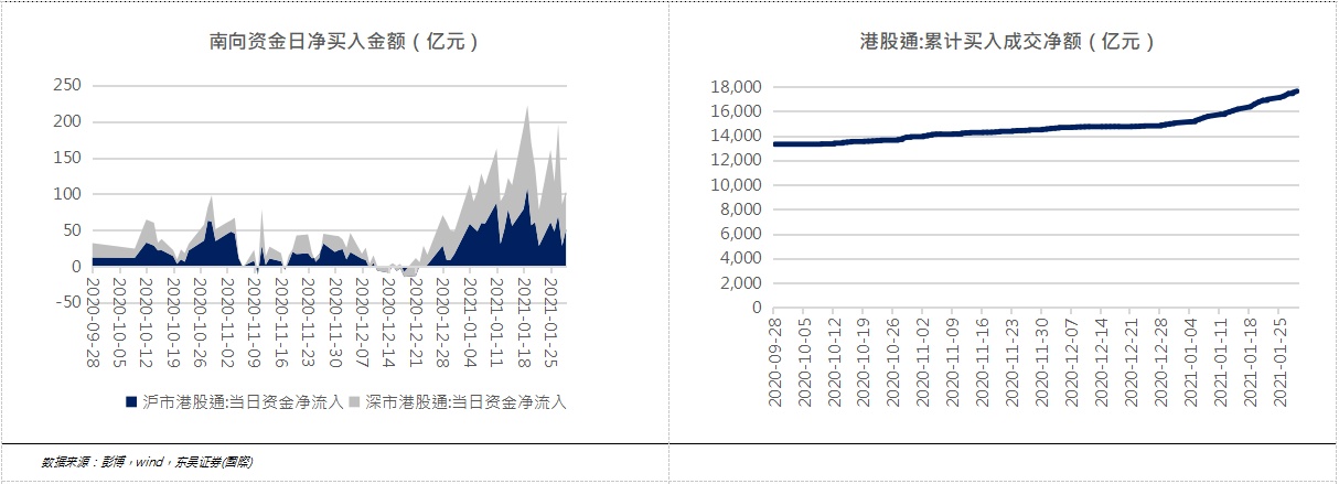在可投港股基金火爆发行的同时,南向资金加速流入港股的趋势愈发明显:2021年1月南向资金日均净买入近130亿元,远远高于2020年11、12月分别为28、23亿元的南向日均净买入额;南向资金截至1月29日累计净买入金额约17626亿元,2021年1月有近2600亿元流入港股市场。