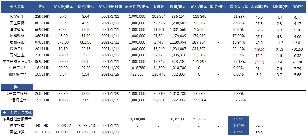 1月11日发布的十大金股组合跑赢恒指2.61%,换入小米集团-W(01810)和邮储银行(01658)。
