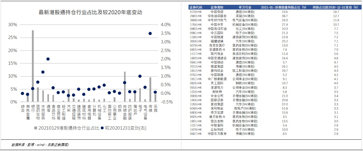 最新港股通持股行业中传媒、通信、休闲服务和电子占比较2020年末有较大提升。