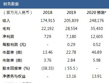 2020年前三季度,公司实现营业收入1754亿元,同比增长17.4%,经调整净利润98亿元,同比增长6.7%,经调整净利率5.6%。媒体预期20E/21E净利润增速75.6%/40%,当前价格对应20E/21E市盈率46.89x/34.57x。