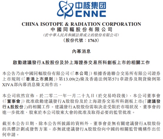 1月29日晚间,中国同位素及辐射技术应用领域龙头中国同辐(01763)发布公告称,公司董事会批准启动建议发行A股股份及于上海证券交易所科创板上市的相关工作。