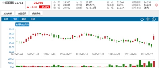 即便当下中国同辐的“回A”只是迈出了第一步,却依然不改资本市场对其看好,资金蜂拥而至。2月1日,中国同辐高开高走一度大涨超20%,盘中股价一度接近28港元,截至收盘略有回落,涨幅收窄至19.78%,最新总市值86.2亿港元。