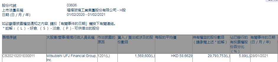 智通财经APP获悉,香港联交所最新资料显示,1月28日,Mitsubishi UFJ Financial Group, Inc.减持福耀玻璃(03606)156.96万股,每股作价58.6629港元,总金额约为9207.7万港元。减持后最新持股数目约为2979.4万股,最新持股比例为5.89%。