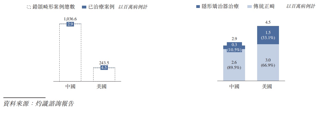 渗透率上,中国的隐形矫治市场目前仍处于起步阶段,相较于美国等发达国家而言,渗透率仍比较低。于2019年,在中国经治疗的2.9百万例错颌畸形病例中,仅10.5%采用隐形矫治器治疗,而在美国经治疗的4.5百万例错颌畸形病例中,33.1%采用隐形矫治器治疗,其中的差异进一步表明中国隐形矫治市场渗透率较低的事实。