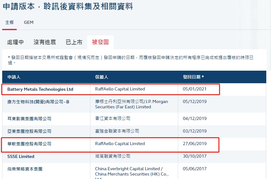 据悉,港交所自2014年起就上市保荐人实施新规,被否决的上市申请会被刊登于港交所的“被发回”清单上,并且永久记录。截至目前,主板、创业板(GEM)分别有12宗、 10 宗上市申请被发回。