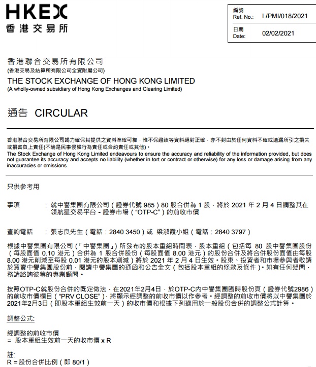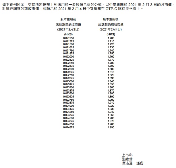 按照领航星交易平台-证券市场(OTP-C)就股份合并的既定做法,在2021年2月4日,于OTP-C内中誉集团临时股份页(证券代号2986)的前收市价栏目(PRV CLOSE),将显示经调整的前收市价以作参考。经调整的前收市价将以中誉集团于2021年2月3日(即股本重组生效前一天)的收市价和根据适用于一般股份合并的调整公式计算。