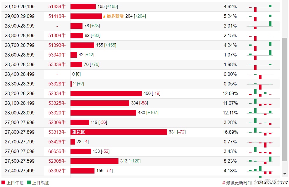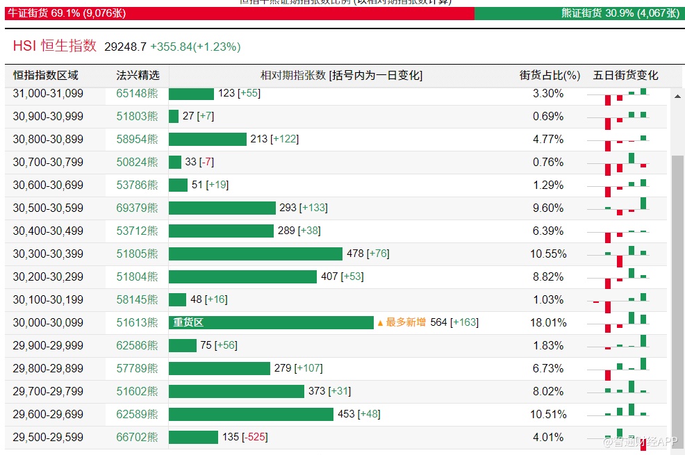 法兴恒指牛熊证街货分布图中的数据显示,熊证街货重货区在30000-30099区间,该区间最新熊证数量为564张,较上一交易日增加163张,最多新增也在该区间。牛证街货重货区在27800-27899区间,该区间最新牛证数量为631张,较上一交易日减少72张。最多新增在29000-29099区间,该区间最新牛证数量为204张,较上一交易日增加204张。