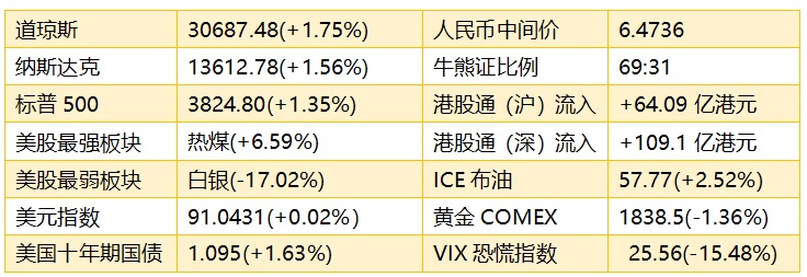 1、隔夜美股截至收盘,道琼斯指数涨475.57点,涨幅1.57%,报30687.48点;标普500指数涨50.94点,涨幅1.35%,报3824.80点;纳斯达克综合指数涨209.38点,涨幅1.56%,报13612.78点。港股ADR指数小幅下挫,按比例计算收报29240点,跌7.56点或0.03%。
