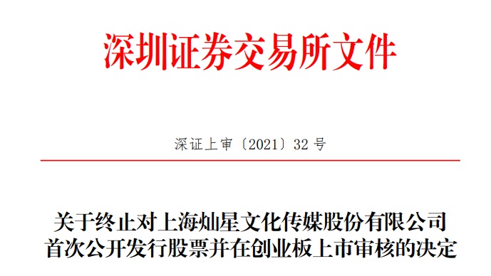智通财经APP获悉,2月2日,创业板上市委员会2021年第9次审议会议公告,上海灿星文化传媒股份有限公司(灿星文化)首发不通过,终止审核。